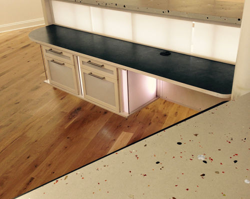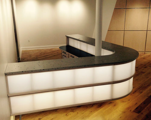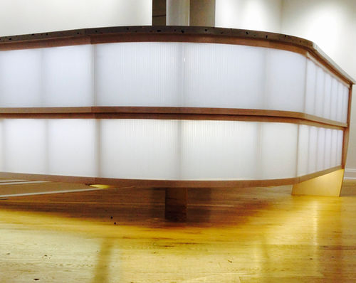 This Reception Desk is made from Bleached Maple and translucent Hollow Core Polymer panels. The top is polished concrete imbedded with glass rods so the light transmits through the concrete. The design is sort of like a Japanese Lantern in the shape of a desk hovering above the floor. At night the Gallery is dark except for the illuminated reception desk, and very dramatic to passersby seeing it suspended through the windows. The engineering challenge was to have the cabinet bridge the space above the floor, and hide the structure with continuous inline sliding doors around the front. Very etherial. The desk itself is V shaped, 19’ long (< 6 meters).